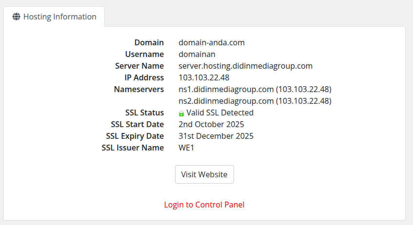 Untuk masuk ke dalam Control Panel hosting anda, silahkan scroll ke bawah dan klik Login to Control Panel.